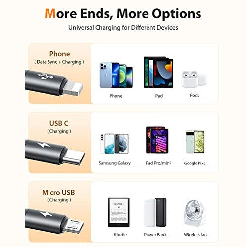 • Benefits: Streamlines your tech setup with one cable for all devices, saves space with its retractable feature, and charges devices quickly and safely