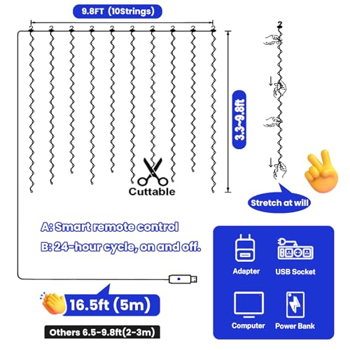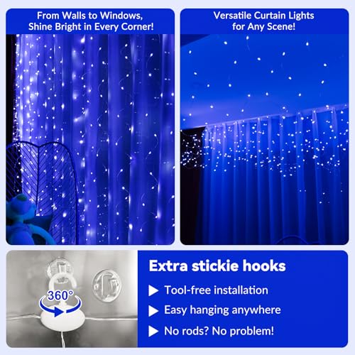 Hxweiye - 300LED Blue Fairy Curtain Lights, 9.8x9.8Ft, USB, 8 Modes, Timer