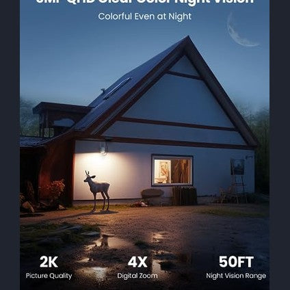 • 2K Quad HD & Color Night Vision: Capture clear images and videos in 3MP HD, even in low light, with adjustable night vision modes.