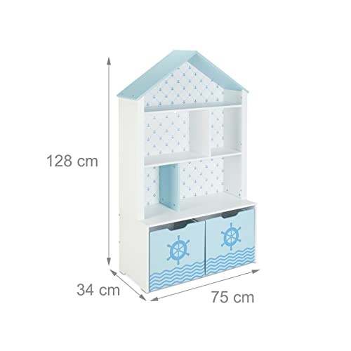 This charming children's shelf combines functionality with playful design, featuring a house shape and nautical motifs, perfect for organizing toys and books in a kid's room.