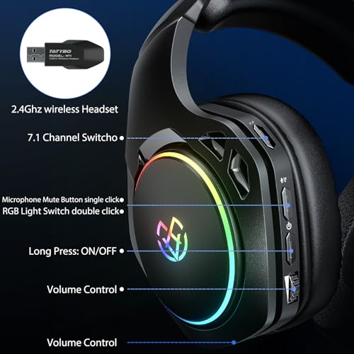 Tatybo - 2.4GHz Wireless Gaming Headset with Detachable Mic, 20hr Battery