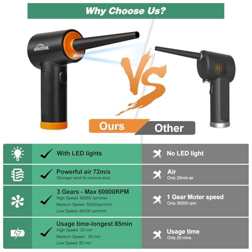 Whatook - Cordless Electric Air Blower, 3-Speed, 60000 RPM, Rechargeable Duster